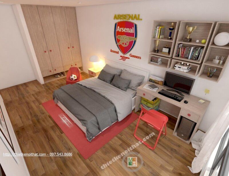 Giường ngủ chung cư được thiết kế theo phong cách hiện đại, trẻ trung, kết hợp tab liền kề tạo sự thuận tiện cho gia chủ trong quá trình sử dụng