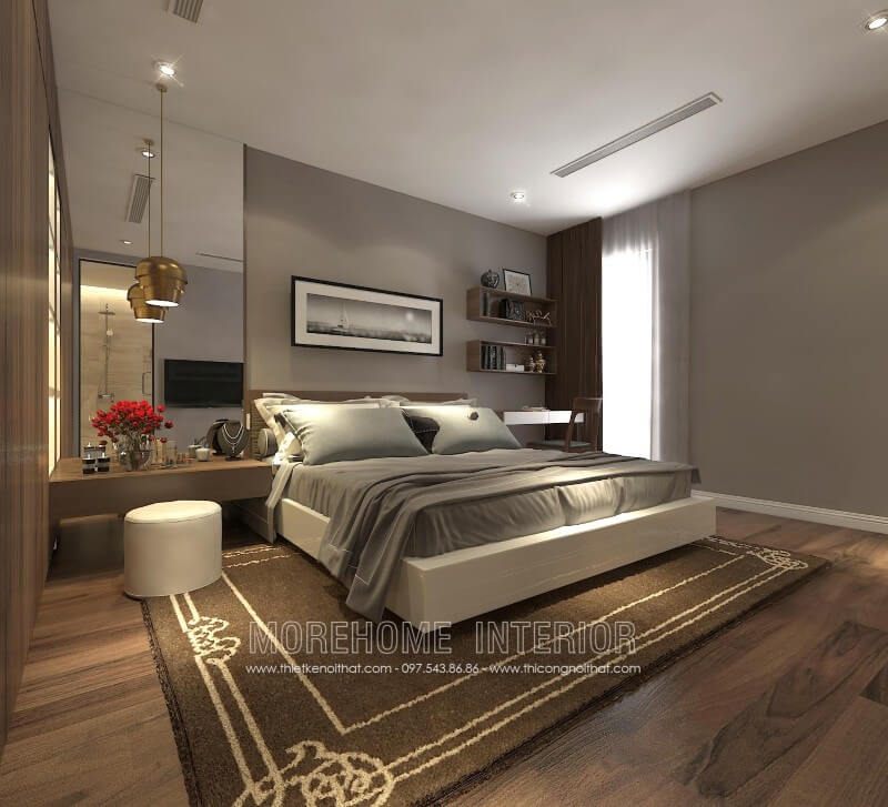 Giường ngủ chung cư hiện đại, được đặt chính giữa căn phòng mang lại cảm giác cân bằng và đảm bảo cho sự nghỉ ngơi được thoải mái hơn