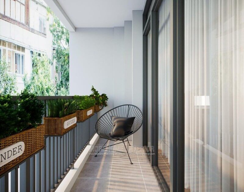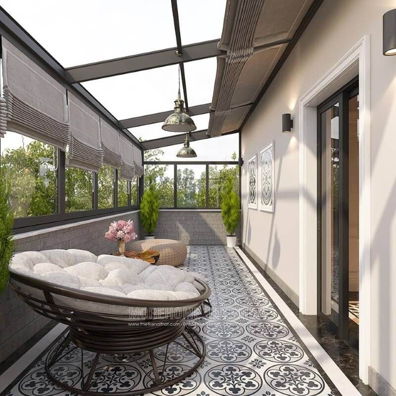Ban công đẹp, độc đáo với hệ cửa kín nhưng không bí bách bởi ý tưởng sử dụng kính cường lực cao cấp cùng rèm chắn giúp không gian luôn được thông thoáng nhưng lại chắn được gió, ánh sáng khi cần thiết.
