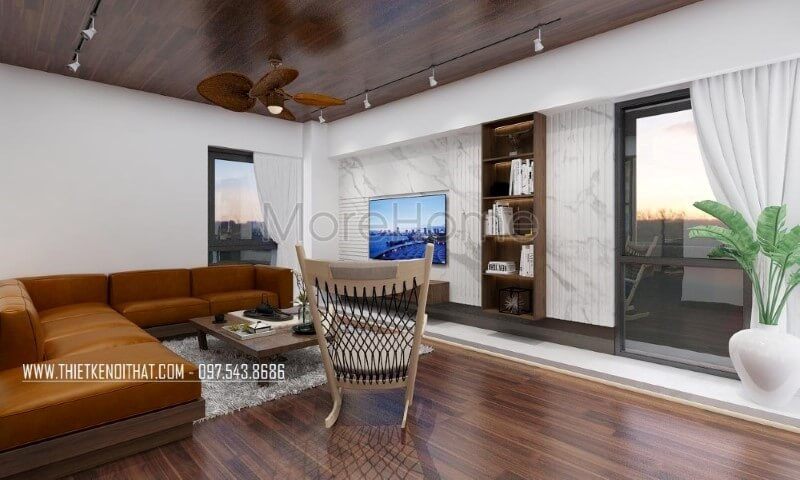 Phòng khách hiện đại, đẹp, sang trọng với ý tưởng kết hợp giữa sắc trắng cùng nét trầm từ gỗ ốp tường, gỗ lát sàn.