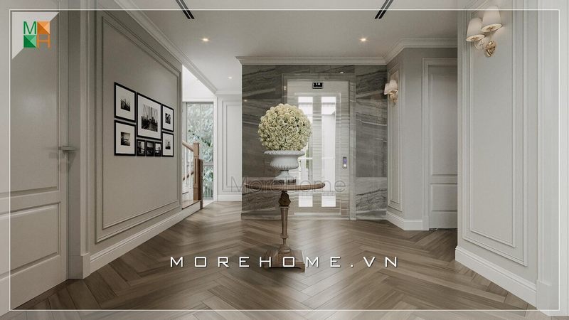 Tranh treo sáu tấm nổi bật cách nghệ thuật trong hành lang tầng của biệt thự, nhà phố.