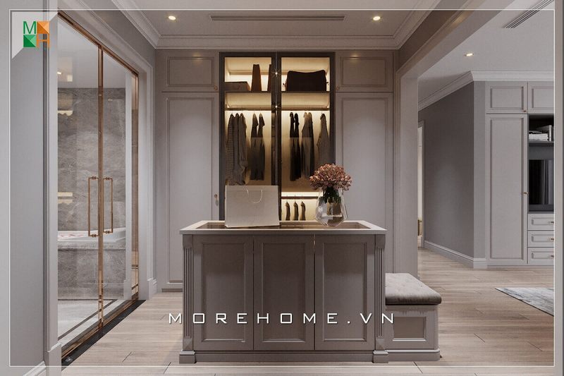 Không đơn thuần chỉ là một căn phòng để đồ đơn điệu của căn hộ chung cư, nhà phố, biệt thự mà nhà thiết kế rất sáng tạo khi thiết kế hai tủ đồ gỗ cánh kính hiện đại hai bên tường, vừa tận dụng được không gian mà còn thể hiện tính thẩm mỹ cao.