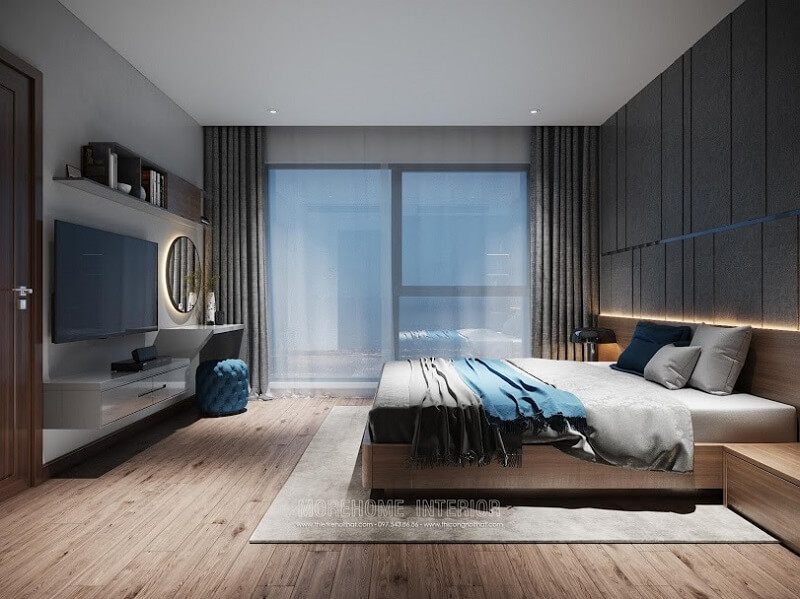 Kích thước kệ tivi gỗ óc chó vừa phải, được thiết kế cân đối với giường ngủ, tivi và không gian diện tích phòng.