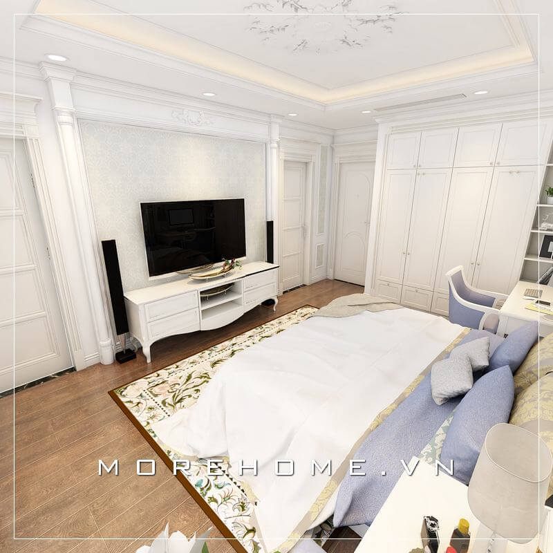 Mẫu kệ tivi tân cổ điển tại phòng ngủ này được làm từ gỗ tự nhiên cao cấp sơn màu trắng tiện nghi, sang trọng