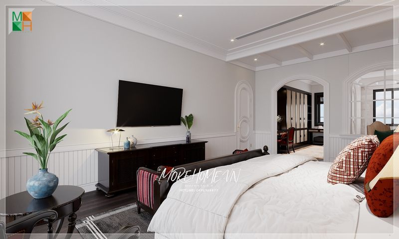 Giường bọc nệm trắng kết hợp sắc trầm từ ghế, đôn sofa, kệ tivi gỗ óc chó đã tạo nên bức tranh hài hòa, đẹp, sang trọng trong phòng ngủ master tân cổ điển.