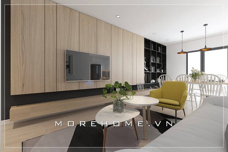 Bố trí phòng khách với nội thất gỗ hiện đại tone màu xám tạo cảm giác ấm cúng và thân thiện cho nhà chung cư