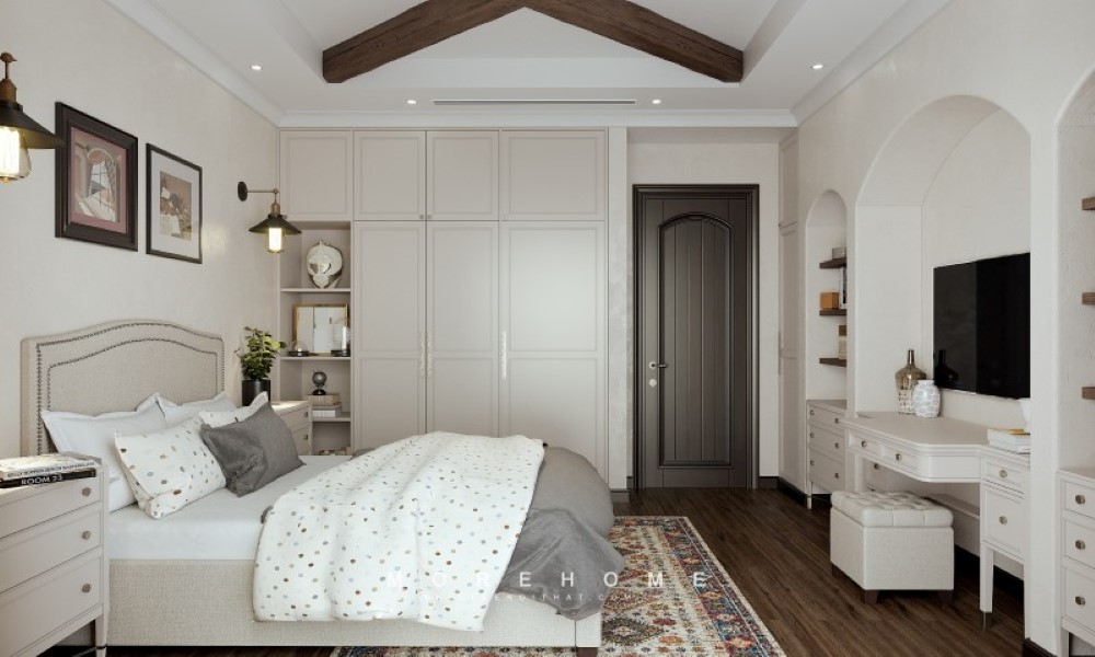 Tủ quần áo 4 cánh gỗ tự nhiên màu trắng âm tường có diện tích phía bên trên rộng rãi, giúp sử dụng tối ưu cho việc lưu trữ và sắp xếp đồ đạc một cách thoải mái.
